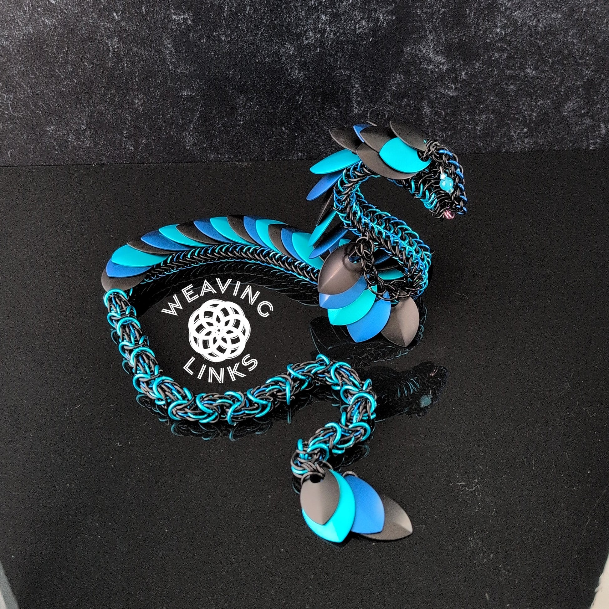 All rings and scales are anodized aluminum. Length is approx 28” from head to tail. A lobster clasp at the end of the tail can connect to itself anywhere on the tail or the side of the body. Ready to ship.