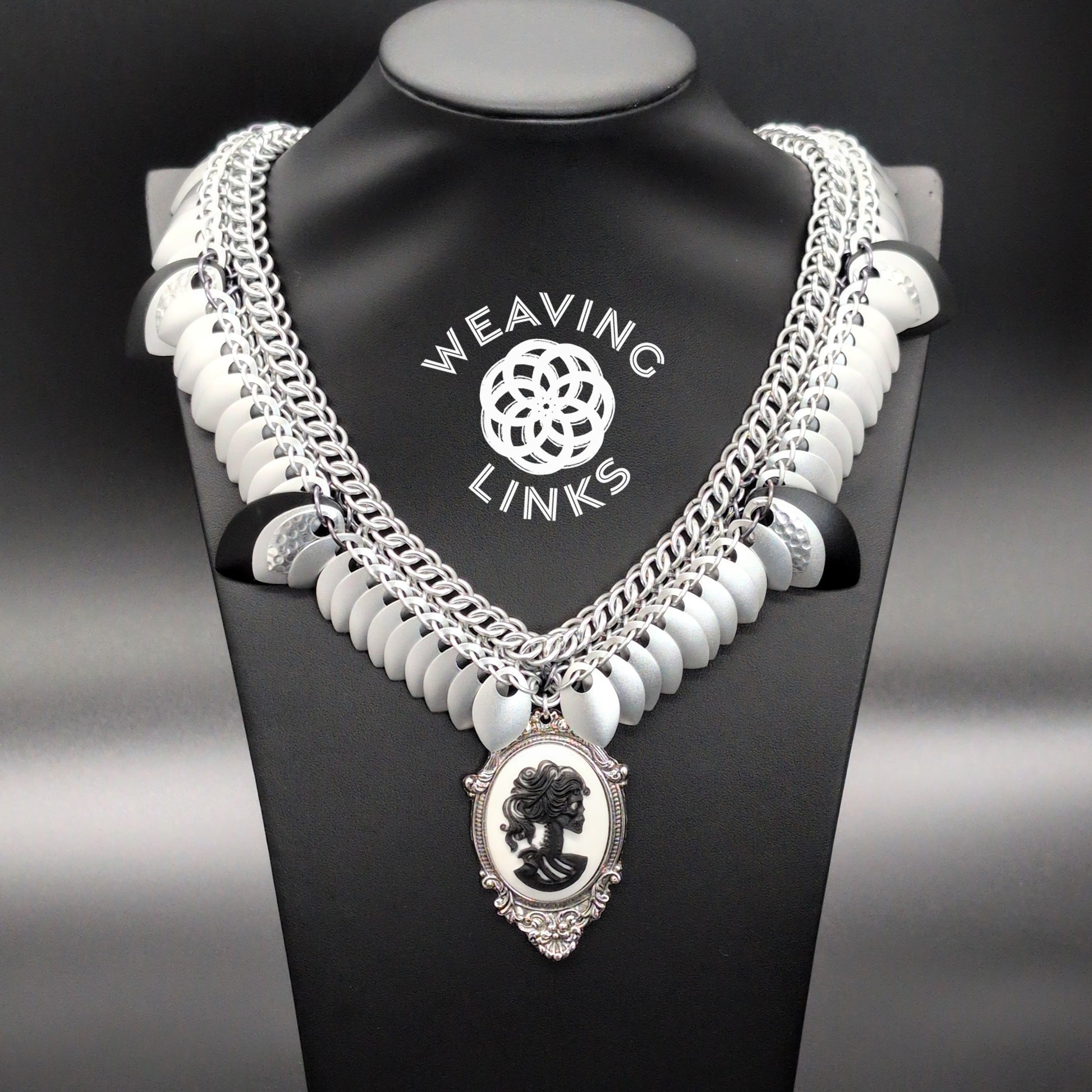 Simple strand of scales that drape around your neck, each with a gothic cameo charm. Interesting lines, this piece will draw many compliments.