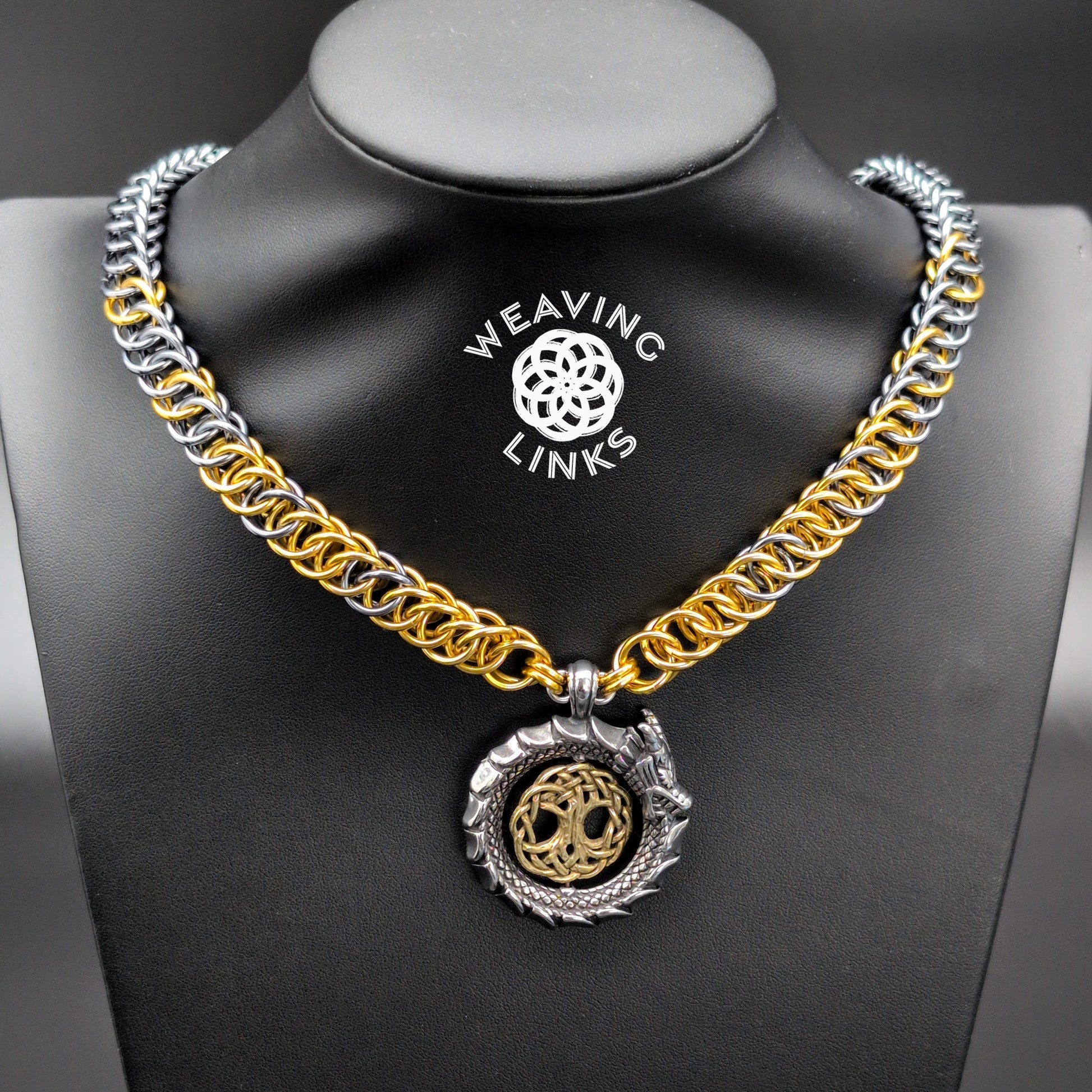 Half Persian 4 in 1 necklace woven in an interesting pattern, designed to match with a stainless steel gold and silver ouroborus dragon charm. The tree in the center of the dragon spins, making it the perfect fidget.
