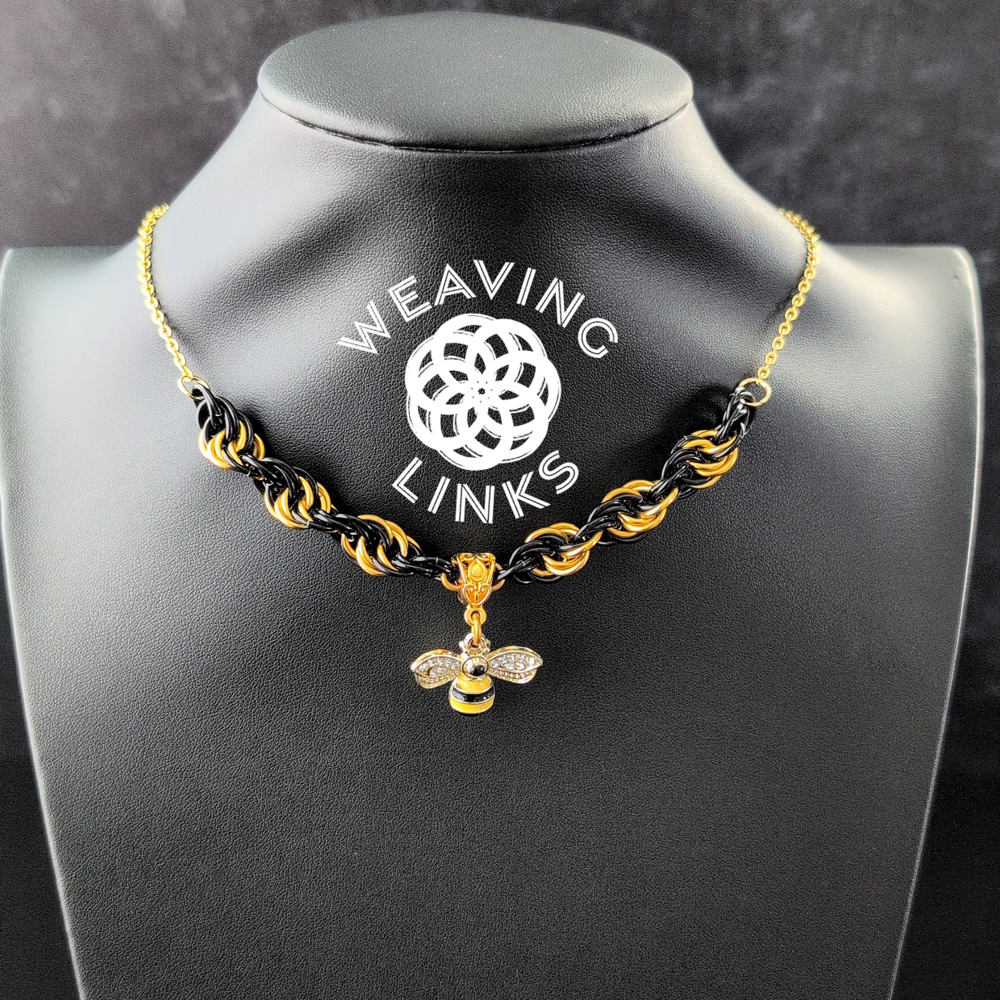 A bold black and yellow necklace woven in either triskelion or vertebrae, with an adorable bee charm hanging from the center. A gold stainless steel chain connects the two ends of the weave together.