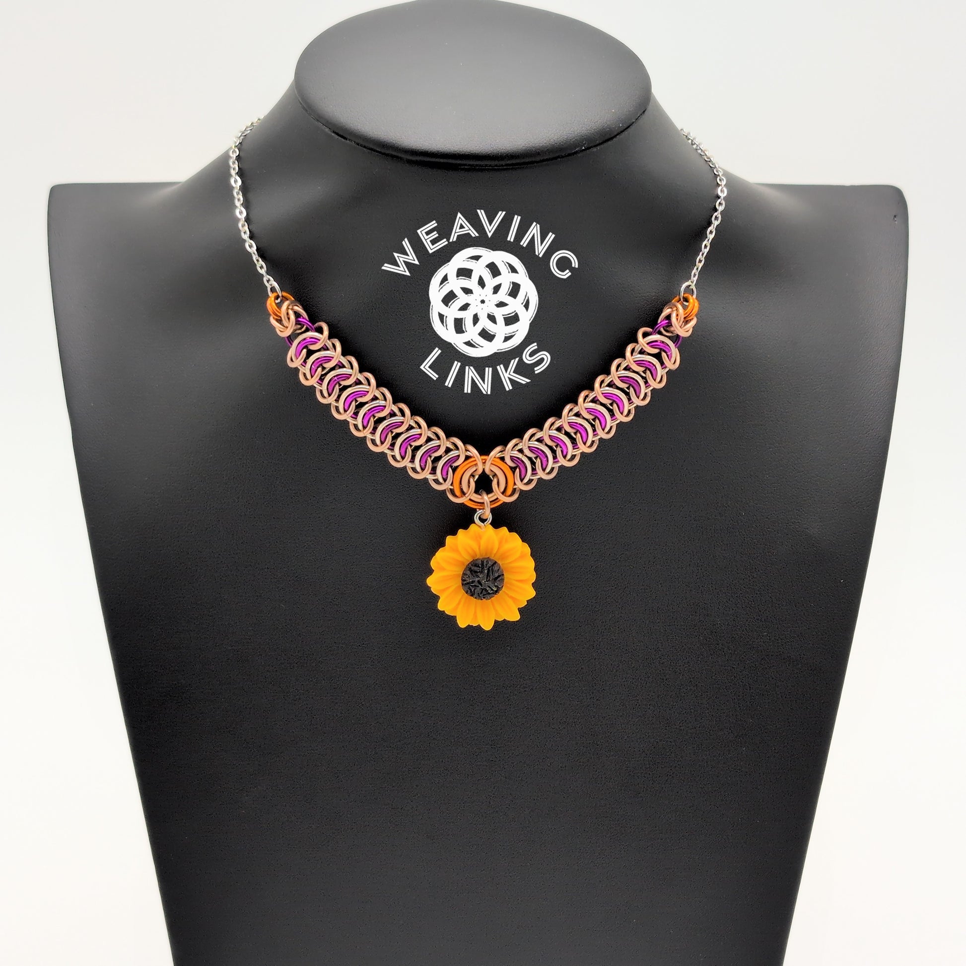 Sunflower necklace woven in either triskelion or vertebrae, with an adorable sunflower charm hanging from the center. A stainless steel chain connects the two ends of weave together.