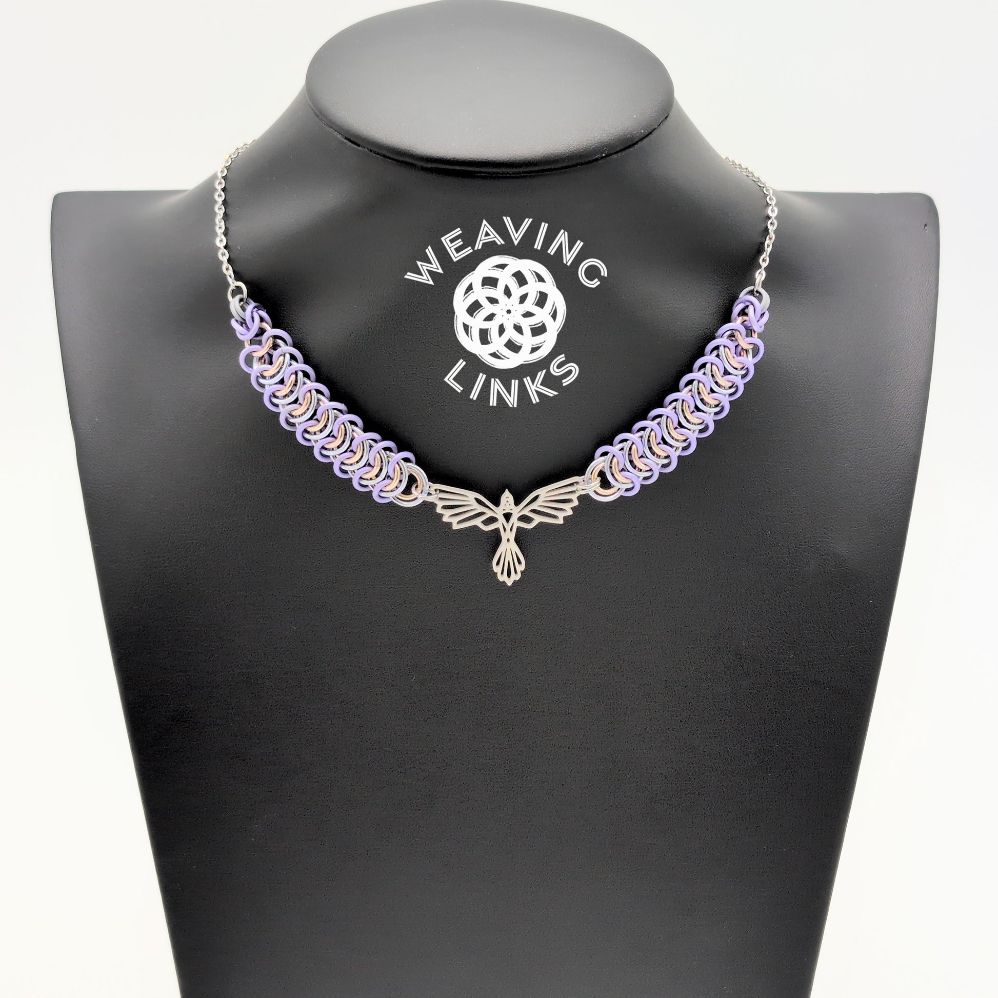 A stunning phoenix charm hangs between two strands of vertebrae weave. A stainless steel chain connects the two ends of weave together.