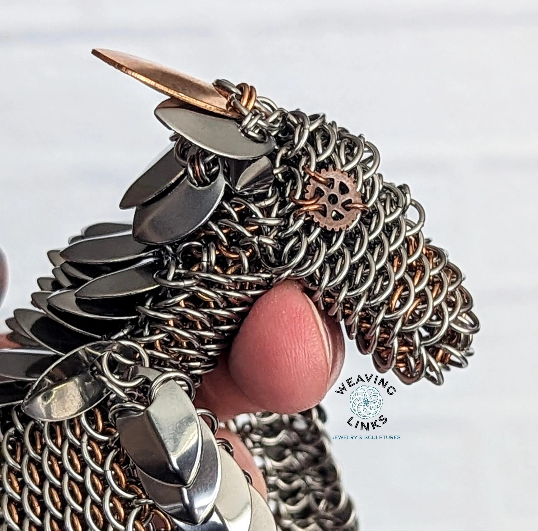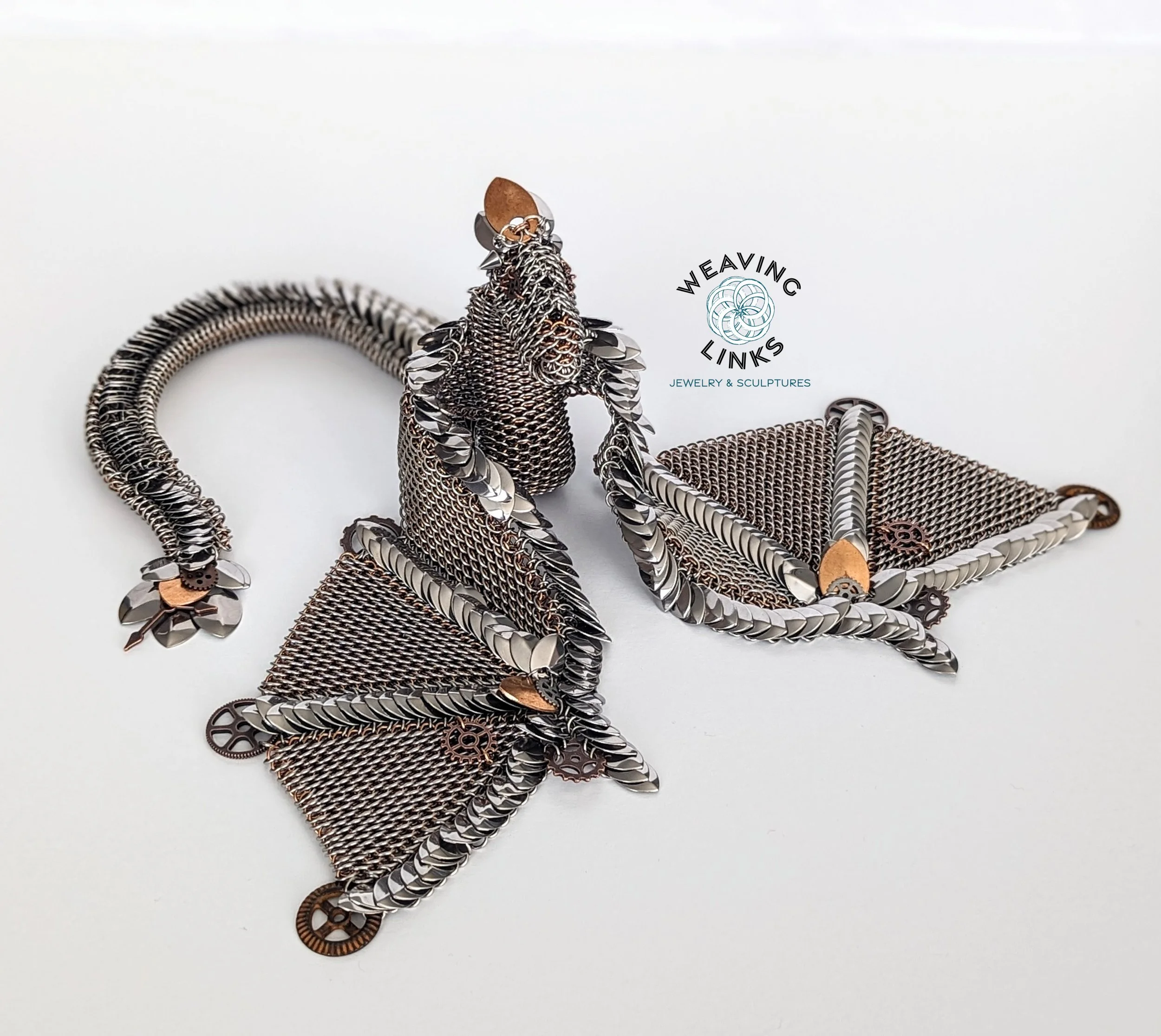 Chainmail dragon woven entirely in intricate dragonscale. Wings are also woven in dragonscale, with scales to give the appearance of cartilage between wing membranes. Ready to ship!